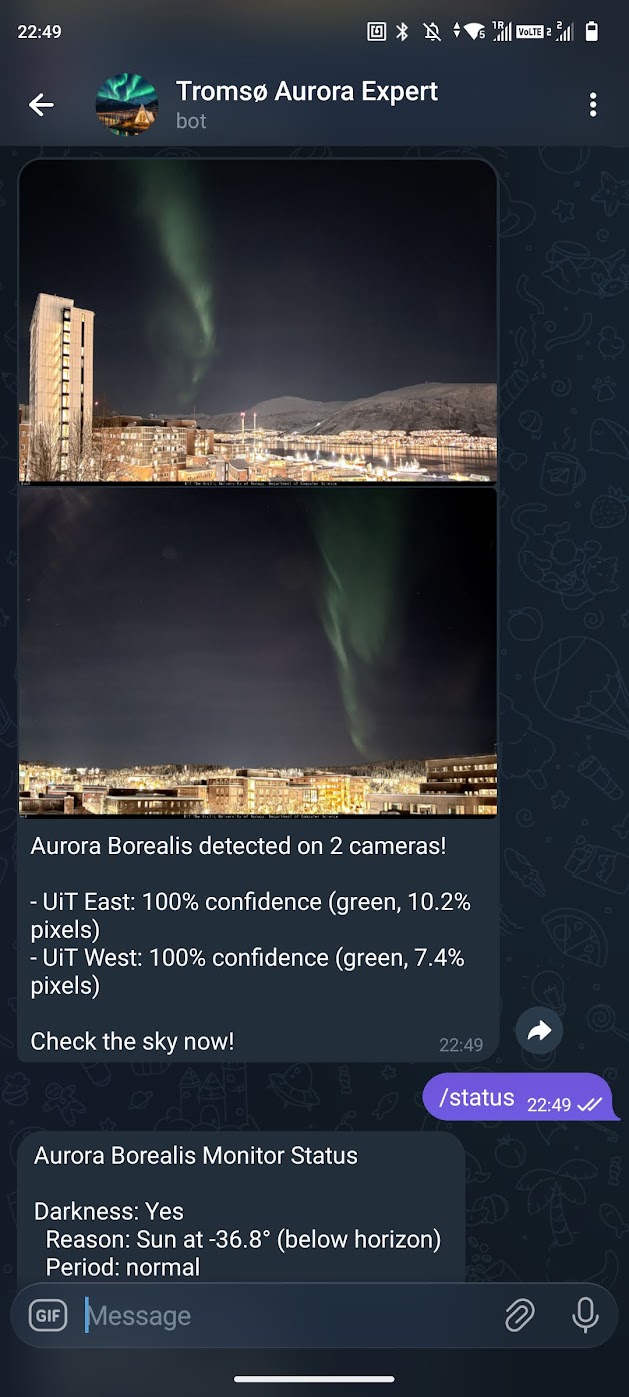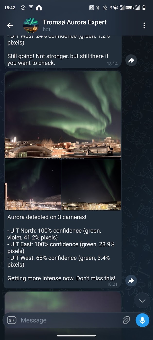 Factual aurora alerts from public cameras around Tromsø.